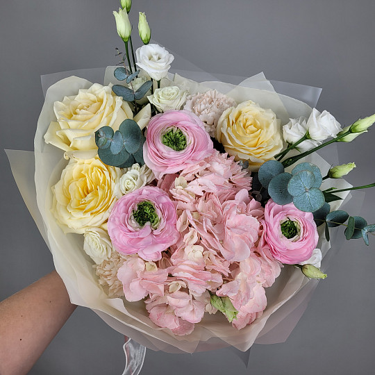 У нас есть также широкий ассортимент цветов и растений для букетов: пионовидные розы, ранункулюсы, гипсофила, гортензия, пионы, лаванда, альстромерия, кустовая роза, герберы, орхидеи, лилии, гвоздика, тюльпаны хризантемы, розовая роза, желтая роза и другие цветы.