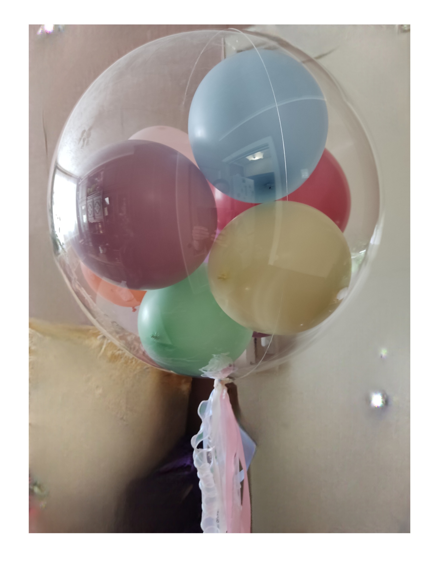 Сам шар великолепен. Большой, кристально прозрачный, нежные пастельные оттенки шариков-наполнителей. А эти чудесные ленточки и кружевца! Восторг!
