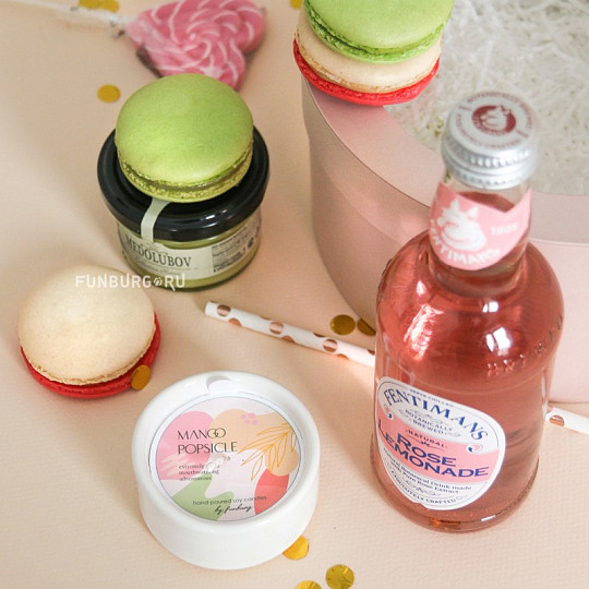 Состав: Сортовая гвоздика (диантус), Розы (50-60 см), Кустовые розы, Гиперикум, Питтоспорум, Сахарный скраб для тела «Laboratorium», Натуральное мыло «Laboratorium», Крем для рук «Laboratorium»