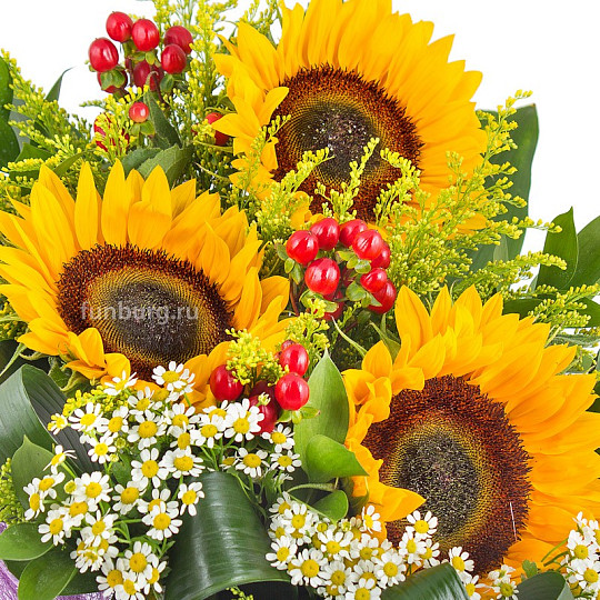 Состав: Подсолнухи, Матрикария (кустовая ромашка), Солидаго, Аспидистра, Рускус, Гиперикум