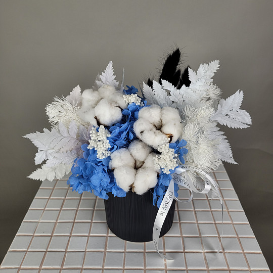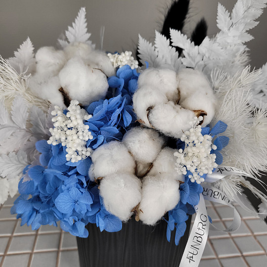 Состав: Стабилизированная гортензия, Хлопок, Амарант стабилизированный (ветка), Стифа, Аспарагус стабилизированный (упаковка), Стабилизированный итальянский рускус, Лагурус (зайцехвост)