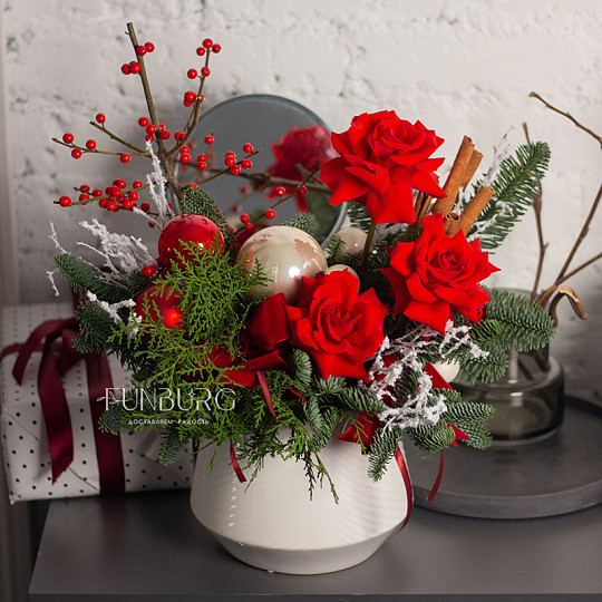 Состав: Нобилис, Туя, Красные розы Nina, Ёлочная игрушка, стекло (6 см), Ёлочная игрушка, стекло (8 см), Елочная игрушка, стекло (⌀ 2,5-3,5 см), Бархатный бант, Заснеженные веточки, Палочка корицы