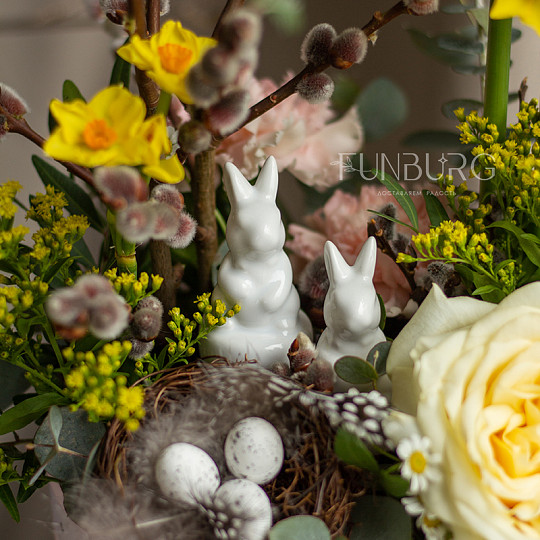 Состав: Сортовые розы (Эквадор), Сортовая гвоздика (диантус), Солидаго, Верба, Эвкалипт, Нарцисс, Керамический зайчик, Декоративное гнездо, Матрикария (кустовая ромашка)