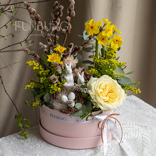 Состав: Сортовые розы (Эквадор), Кустовые пионовидные розы «Бомбастик», Эустома, Верба, Эвкалипт, Нарцисс, Керамический зайчик, Декоративное гнездо, Хлопок