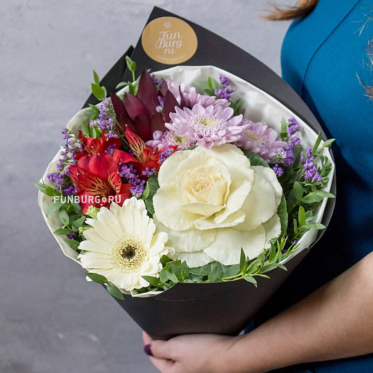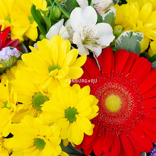 Состав: Герберы, Кустовые хризантемы, Альстромерии, Статица, Питтоспорум
