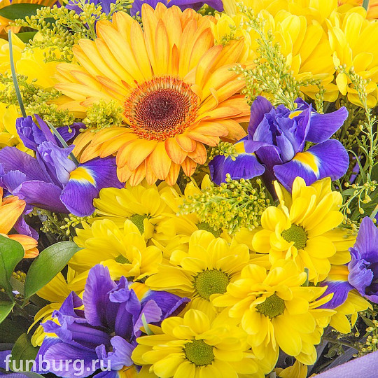Состав: Ирисы, Герберы, Кустовые хризантемы, Солидаго, Рускус