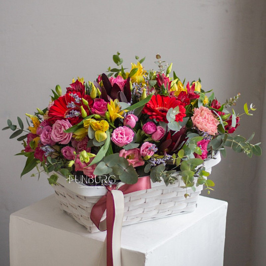 Состав: Герберы, Розы (50-60 см), Альстромерии, Эвкалипт