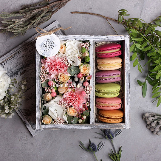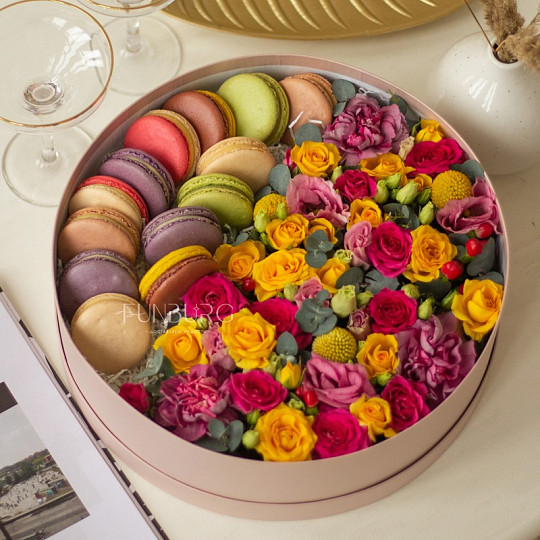 Бесплатная доставка. Отличный подарок для ярких эмоций. Состав букета: розы, гвоздики, кустовые розы, гиперикум, макаруны