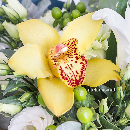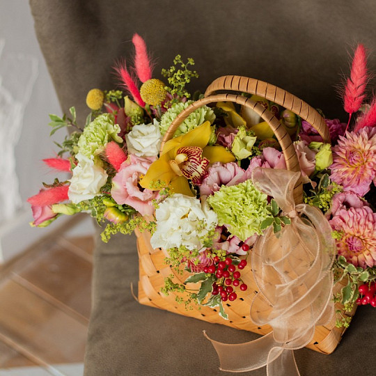 Состав: Эустома, Георгины, Орхидея, Сортовая гвоздика (диантус), Вибурнум (ягоды), Краспедия, Буплерум, Лагурус (зайцехвост), Питтоспорум