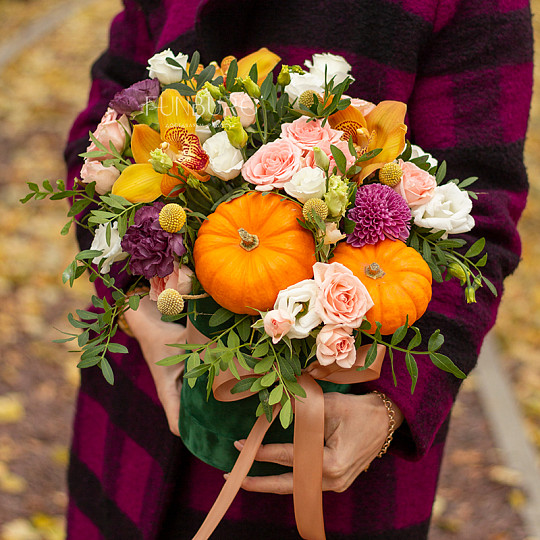 Состав: Эустома, Орхидея, Сортовая гвоздика (диантус), Кустовые розы, Хризантемы, Краспедия, Фисташка, Декоративная тыква