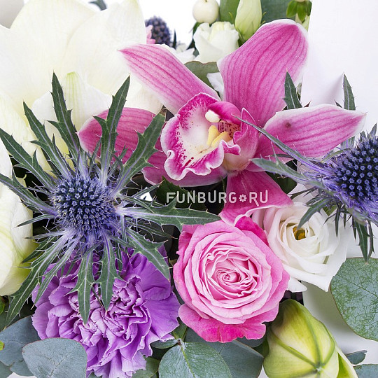 Состав: Лилии, Сортовая гвоздика (диантус), Эустома, Кустовые розы, Орхидея, Гиперикум, Эрингиум, Эвкалипт