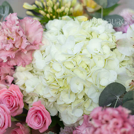 Состав: Гортензия, Эустома, Сортовая гвоздика (диантус), Альстромерии, Кустовые хризантемы Сантини, Кустовые розы, Эвкалипт