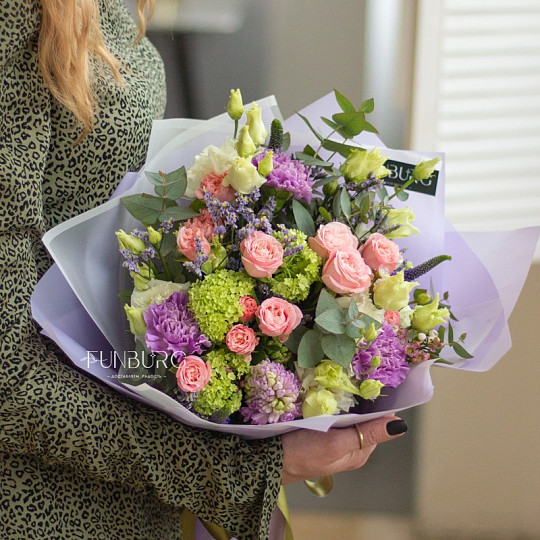 Состав: Сортовая гвоздика (диантус), Кустовые пионовидные розы «Бомбастик», Гиацинт, Лимониум, Эустома, Вибурнум, Ваксфлауэр, Вероника, Эвкалипт