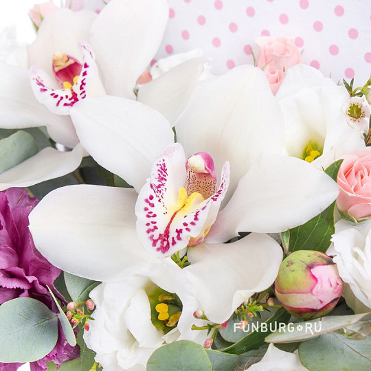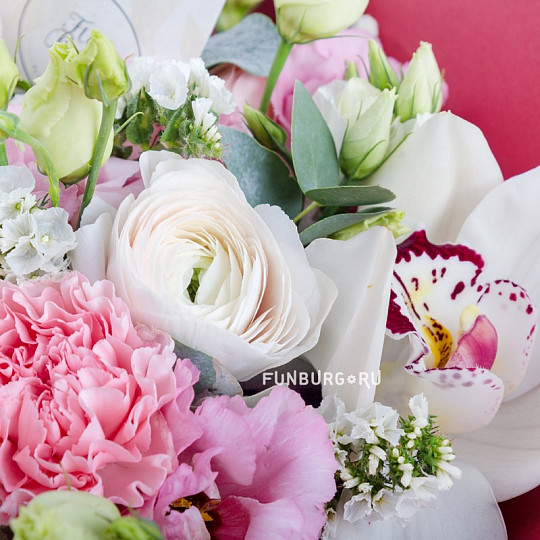 Состав: Орхидея, Ранункулюс, Сортовая гвоздика (диантус), Эустома, Кустовые розы, Статица, Эвкалипт