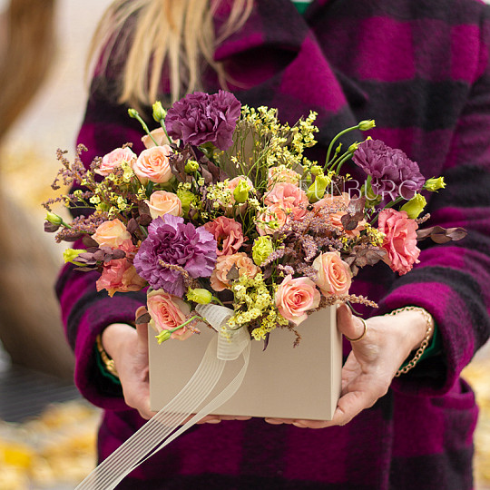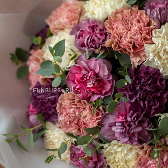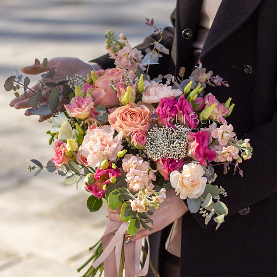 Состав: Ранункулюс, Сортовая гвоздика (диантус), Маттиола, Эустома, Озотамнус, Лимониум, Эвкалипт, Фрезия