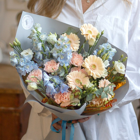 Состав: Дельфиниум, Герберы, Сортовая гвоздика (диантус), Эустома, Эвкалипт