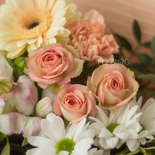 Состав: Кустовые розы, Герберы, Кустовые хризантемы, Сортовая гвоздика (диантус), Питтоспорум