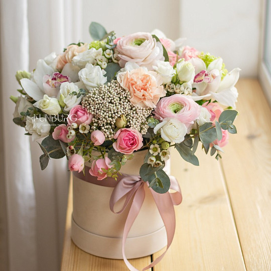 Состав: Ранункулюс, Эустома, Кустовые розы, Вибурнум, Орхидея, Озотамнус, Ваксфлауэр, Сортовая гвоздика (диантус), Эвкалипт