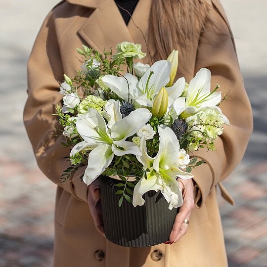 Состав: Лилии, Эустома, Сортовая гвоздика (диантус), Эрингиум, Спирея, Фисташка