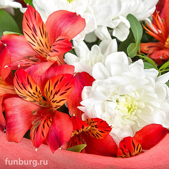 Состав: Кустовые хризантемы, Альстромерии, Гиперикум, Рускус, Фисташка