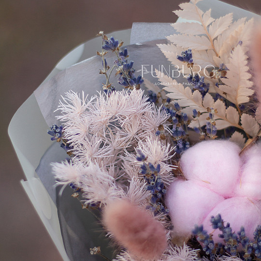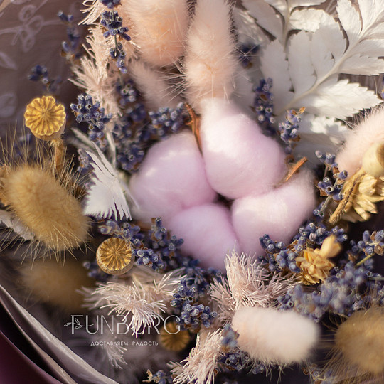Состав: Лаванда, Лагурус (зайцехвост), Хлопок, Аспарагус стабилизированный (упаковка), Пшеница, Коробочки мака декоративные, Стабилизированная зелень (папоротник, туя и т.д.)