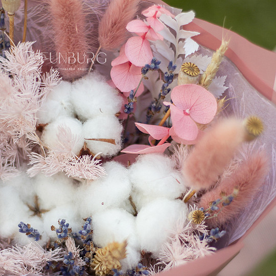 Состав: Стабилизированная гортензия, Хлопок, Амарант стабилизированный (ветка), Стифа, Аспарагус стабилизированный (упаковка), Стабилизированный итальянский рускус, Лагурус (зайцехвост), Перо (30 см), Папоротник стабилизированный (10 шт.), Тростник