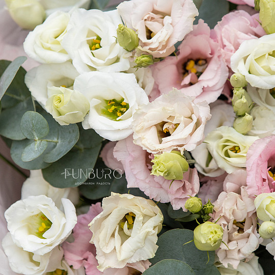 Состав: Пионовидные лилии, Эустома, Эвкалипт