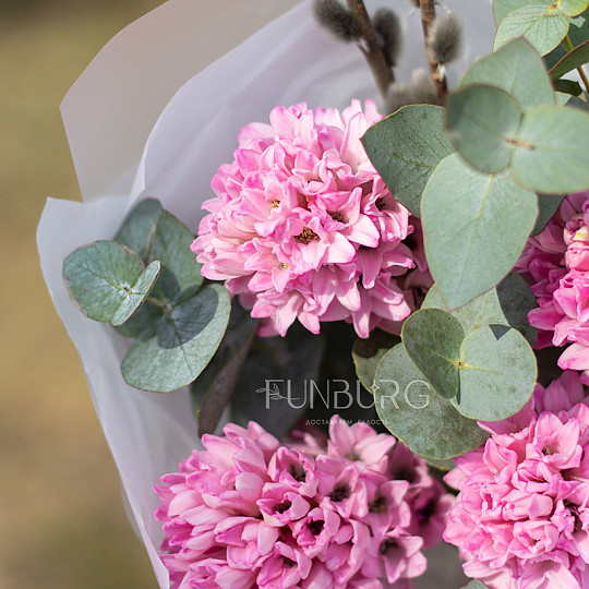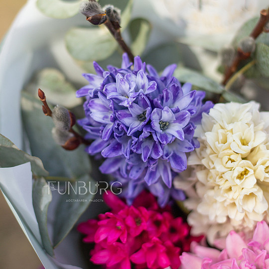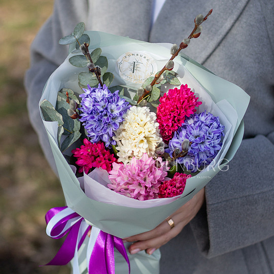 Состав: Тюльпаны, Эустома, Сортовая гвоздика (диантус), Джениста, Эвкалипт