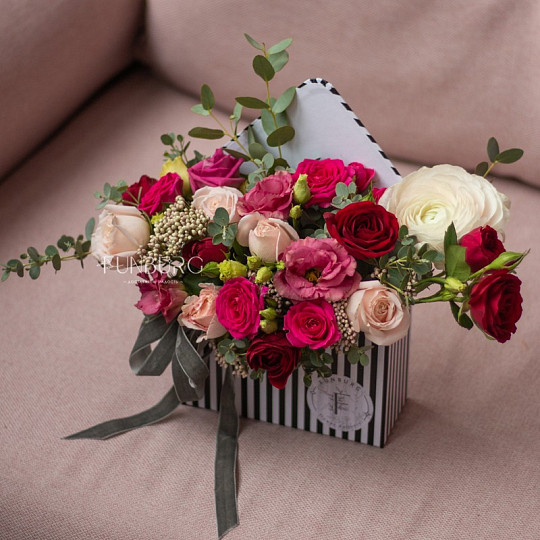 Состав: Ранункулюс, Кустовые розы, Эустома, Эвкалипт