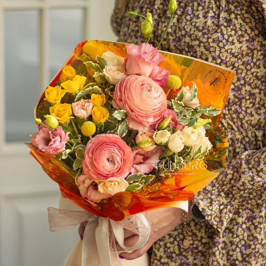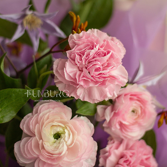 Состав: Ранункулюс, Сортовая гвоздика (диантус), Кустовые розы, Эустома, Краспедия, Питтоспорум