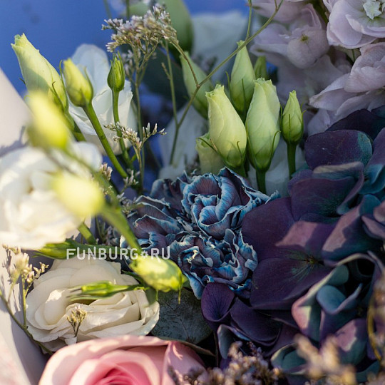 Состав: Гортензия, Сортовая гвоздика (диантус), Дельфиниум, Эустома, Розы (50-60 см), Лимониум, Эвкалипт