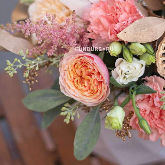 Состав: Пионовидные розы, Сортовая гвоздика (диантус), Эустома, Эвкалипт, Лотос, Астильба