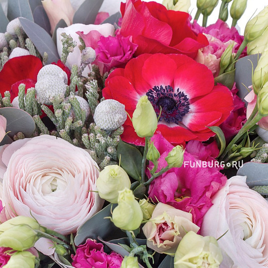 Состав: Анемоны, Ранункулюс, Эустома, Бруния, Эвкалипт