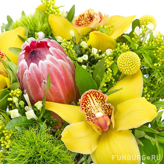 Состав: Орхидея, Протея, Гвоздика «Грин Трик», Краспедия, Бувардия, Солидаго, Рускус, Фисташка