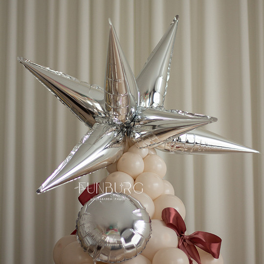 Состав: Шар из фольги «Звезда Сириус» 29″ (серебро), Шар из фольги «Звезда Сириус» 37″ (серебро), Латексный без рисунка, Воздушные шары «Chrome» (ассорти), Основание для фонтана из шаров «Ristretto», «Пакет для транспортировки» (большой)