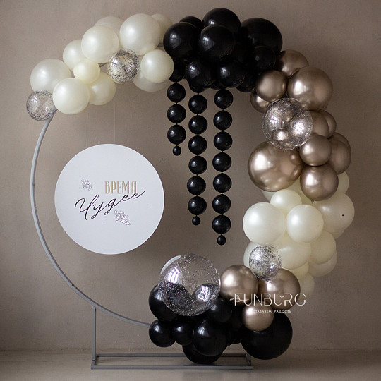 Состав: Разнокалиберная гирлянда из шаров №4, Основание для фонтана из шаров, Латексный с конфетти, Воздушные шары «Chrome» (ассорти), Латексный без рисунка, Выезд оформителя №1, Демонтаж