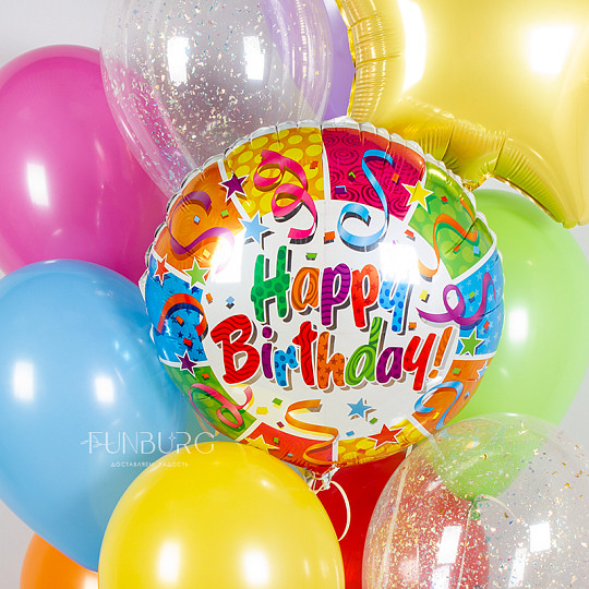 Состав: Шарик из фольги «Happy Birthday» (полевые цветы), Воздушные шары «Chrome» (ассорти), Латексный с конфетти, Латексный без рисунка, Из фольги без рисунка, Груз ручной работы (под цвет шариков), «Пакет для транспортировки» (стандартный)