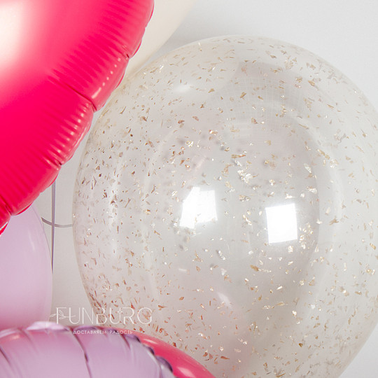 Состав: Шар Bubble с конфетти, Воздушные шары «Chrome» (ассорти), Воздушные шары «Супер Агаты», Латексный без рисунка, Из фольги без рисунка, Груз ручной работы (под цвет шариков), «Пакет для транспортировки» (стандартный)