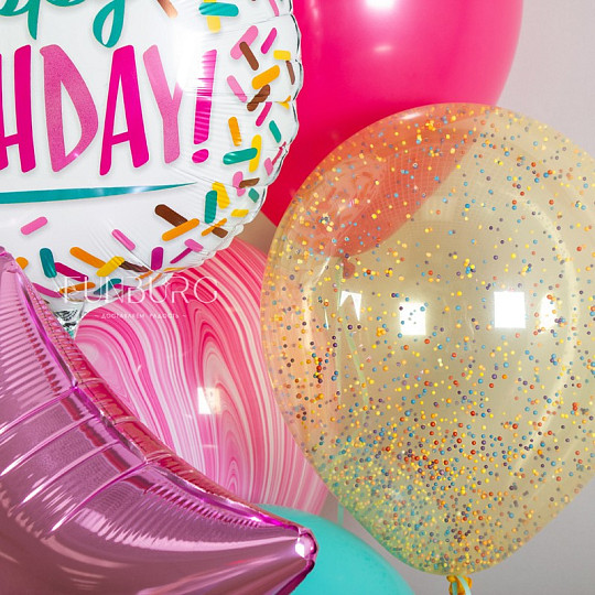 Состав: Шарик из фольги «Happy Birthday» (сладкое конфетти), Латексный с конфетти, Латексный без рисунка, Воздушные шары «Супер Агаты», Из фольги без рисунка, Груз ручной работы (под цвет шариков), «Пакет для транспортировки» (стандартный)