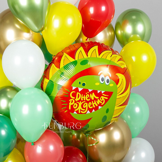 Состав: Шар из фольги «Дракоша» (С днём рождения), Маленький латексный шар 5", Маленький латексный шар 7" Chrome, Маленький латексный шар 5" с воздухом, Коробка для шаров 60×60×60, Атласный бант, Наклейка на коробку 60×60×60 см