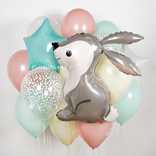 Состав: Шар из фольги «Зайчик», Латексный без рисунка, Воздушные шары «Конфетти» (золото, белый), Из фольги без рисунка, Груз ручной работы (под цвет шариков), «Пакет для транспортировки» (стандартный)