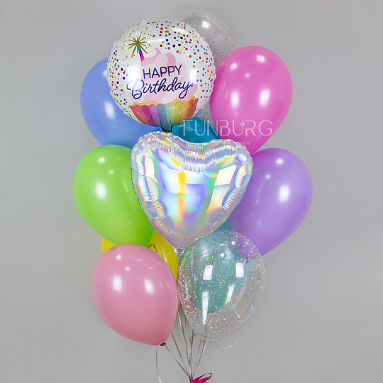 Состав: Шарик из фольги «Happy Birthday!» (кексик), Шар из фольги «Сердце с переливами (перламутр)», Латексный с конфетти Mini (10"), Гелиевые шары без рисунка «Mini» 10″ (ассорти пастель), Груз ручной работы (под цвет шариков), «Пакет для транспортировки» (стандартный)
