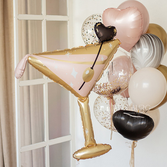 Состав: Шар из фольги «Бокал мартини», Шар Bubble с конфетти «Ночь нежна», Латексный без рисунка, Из фольги без рисунка, Латексный с конфетти, Воздушные шары «Chrome» (ассорти), Воздушные шары «Супер Агаты», Груз ручной работы (под цвет шариков), «Пакет для транспортировки» (большой)