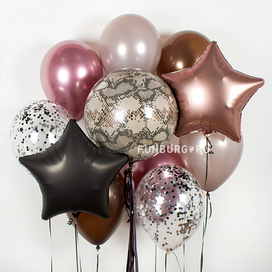 Состав: Шар из фольги «Сфера» (питон), Воздушные шары «Chrome» (ассорти), Латексный с конфетти, Латексный без рисунка, Из фольги без рисунка, Груз ручной работы (под цвет шариков), «Пакет для транспортировки» (стандартный)