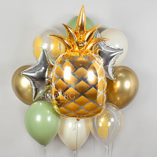 Состав: Шар из фольги «Ананас», Воздушные шары «Ананасы», Из фольги без рисунка, Латексный без рисунка, Воздушные шары «Chrome» (ассорти), Груз ручной работы (под цвет шариков), «Пакет для транспортировки» (стандартный)