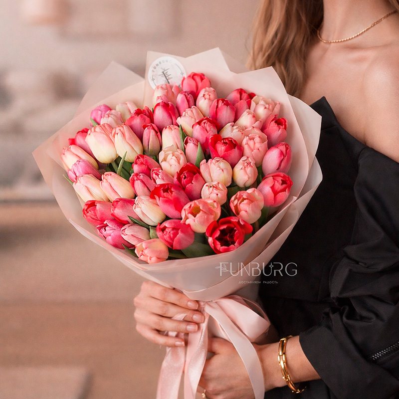 Тюльпаны ярких и нежных оттенков розового будут подвязаны атласной лентой и оформлены в упаковочную бумагу. Если вы хотите добавить зелень, напишите об этом в комментарии к заказу, либо скажите нам при оформлении заказа!