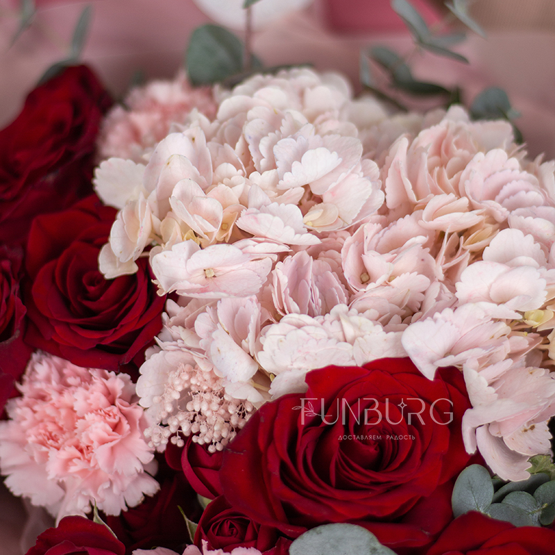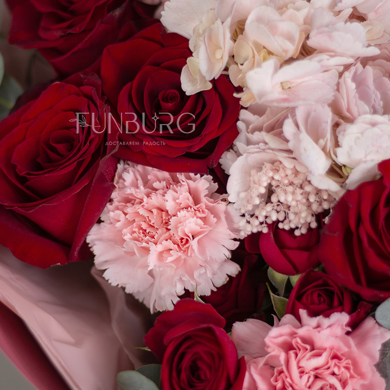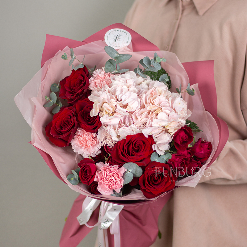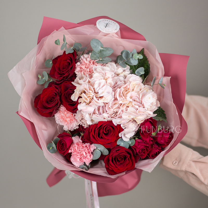 На фотографиях лишь пример, состав будет отличаться для каждого конкретного букета – это ассорти сезонных цветов в оттенках розового и насыщенного красного. Летом в букете могут оказаться пионы или маттиола, а зимой и весной – ранункулюсы и тюльпаны. Вы всегда можете сообщить нам о своих пожеланиях, и мы обязательно их учтем.