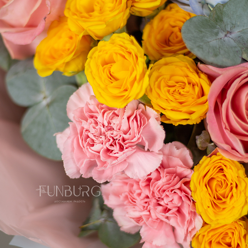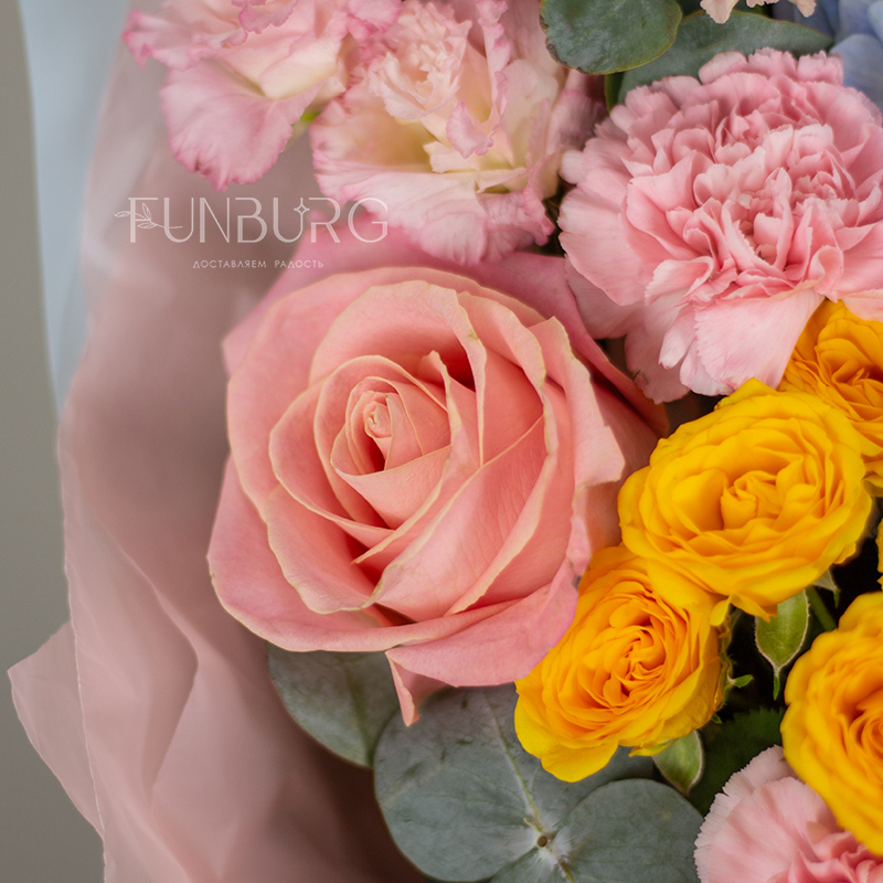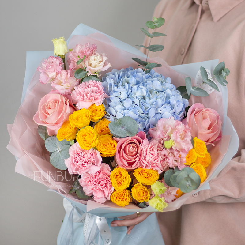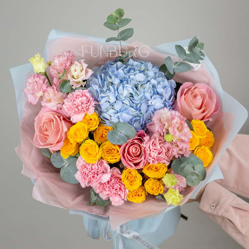 Необычный пышный букет из свежих сезонных цветов в сложной розово-голубой гамме с добавлением лимонного – удобный и красивый способ порадовать близких!