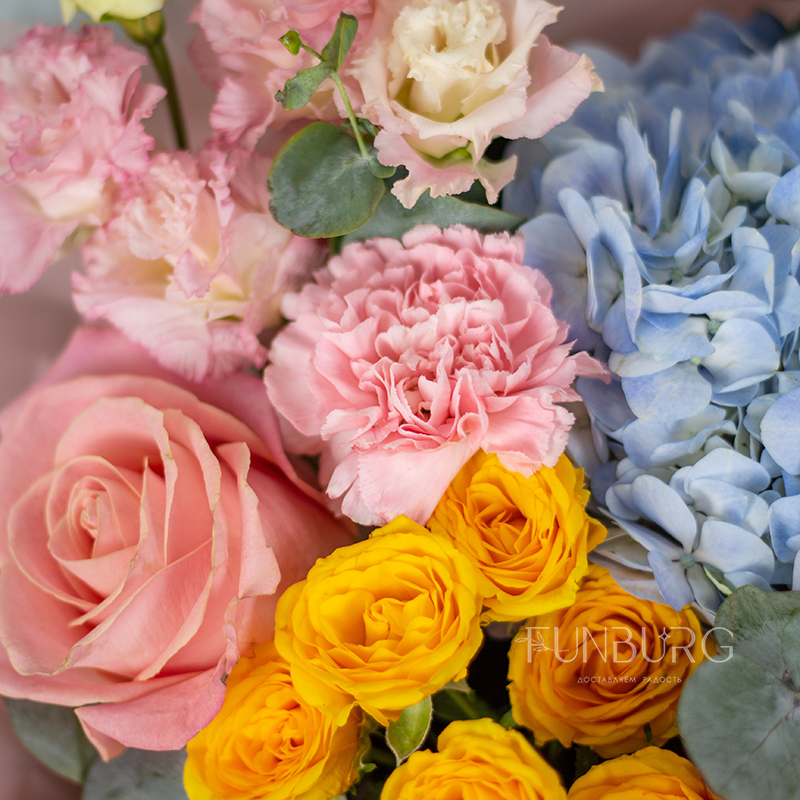 На фотографиях лишь пример, состав будет отличаться для каждого конкретного букета – это ассорти сезонных цветов в лазурной, теплой нежно-розовой и лимонной гамме гамме. Летом в букете могут оказаться пионы или маттиола, а зимой и весной – ранункулюсы и тюльпаны. Вы всегда можете сообщить нам о своих пожеланиях, и мы обязательно их учтем.
