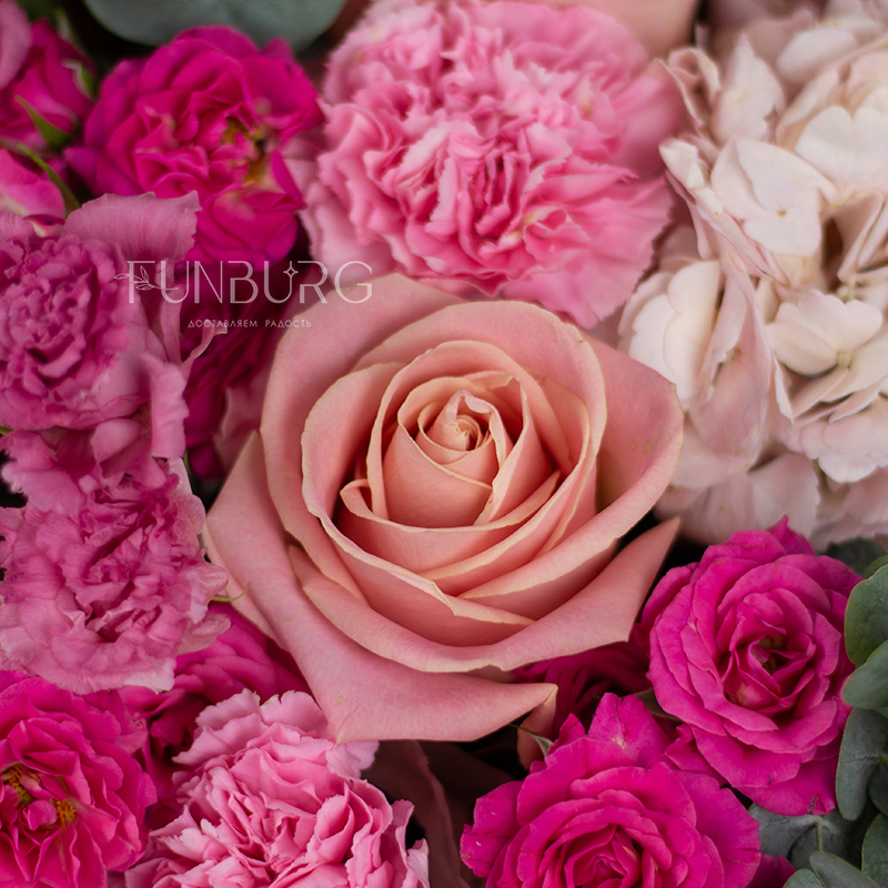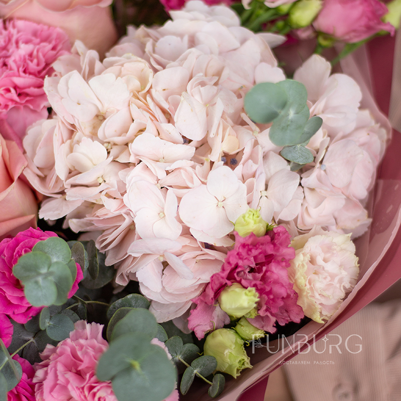 На фотографиях лишь пример, состав будет отличаться для каждого конкретного букета – это ассорти сезонных цветов в оттенках розового. Летом в букете могут оказаться пионы или маттиола, а зимой и весной – ранункулюсы и тюльпаны. Вы всегда можете сообщить нам о своих пожеланиях, и мы обязательно их учтем.